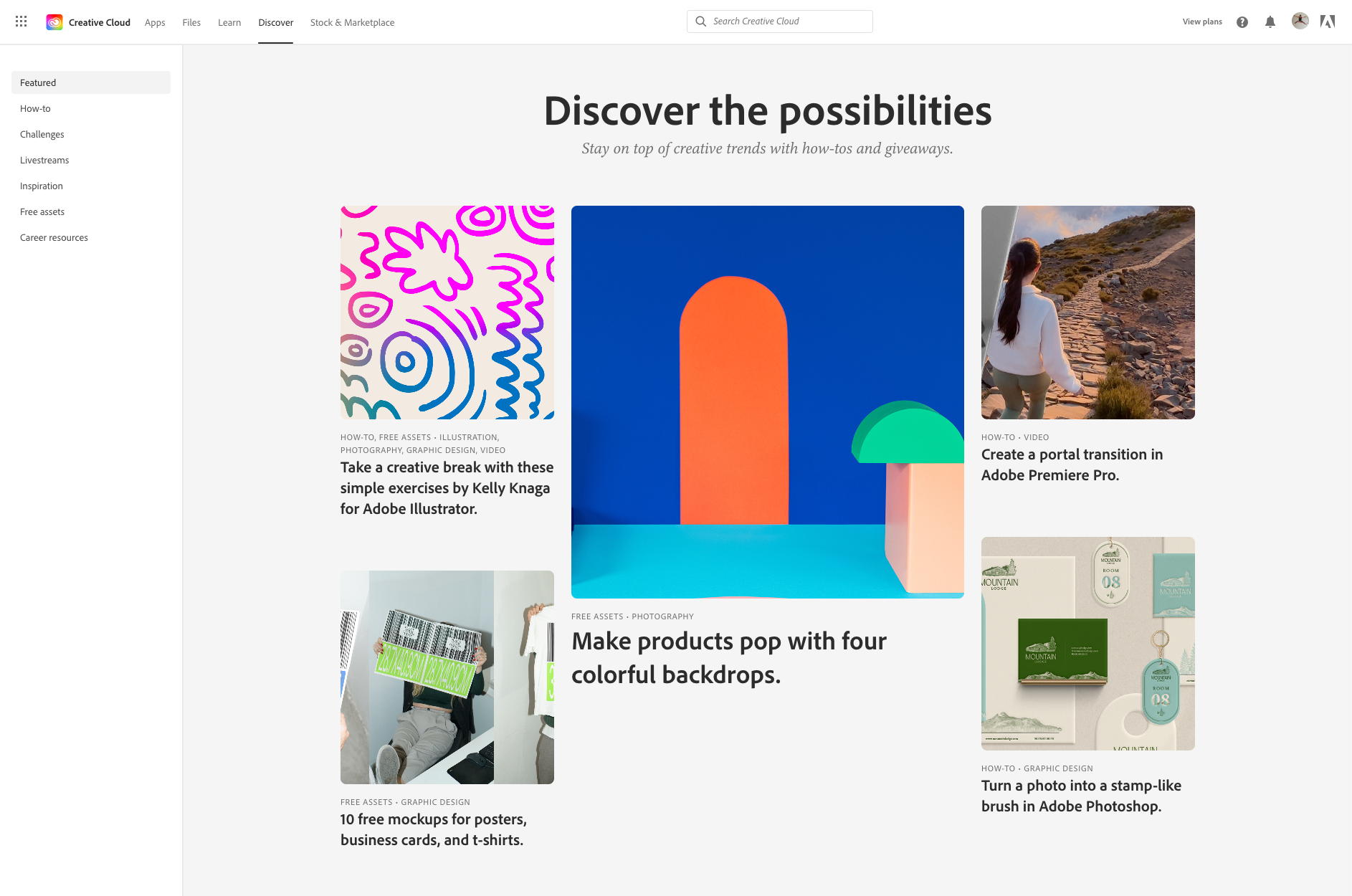 As a digital designer for Adobe, I worked 100% remotely for the Discover & Engagement Design team based in San Francisco. I produced digital content for the Creative Cloud Discover platform creating tutorial articles, free asset giveaways, and social media content working with writers, editors, video and social media specialists. Together we published weekly and monthly articles to drive membership engagement with the Adobe Creative Suite of creative apps. These include Adobe Photoshop, Adobe Illustrator, Adobe Lightroom, Adobe Premiere Pro. View examples at Adobe Creative Cloud.